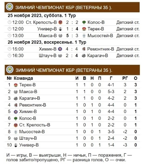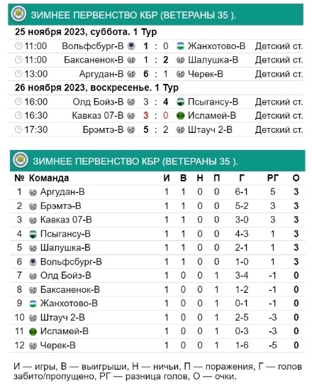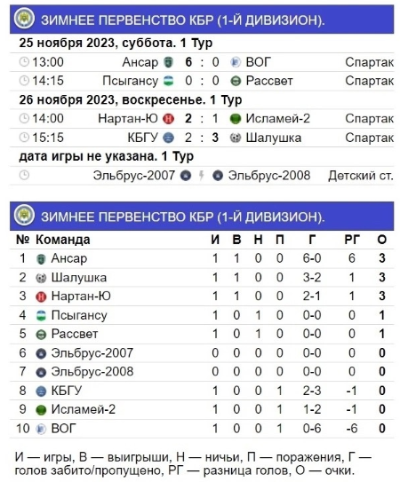 Результаты матчей и турнирные таблицы первого дивизиона, чемпионата и первенства ветеранов после первого тура даны в иллюстрации.