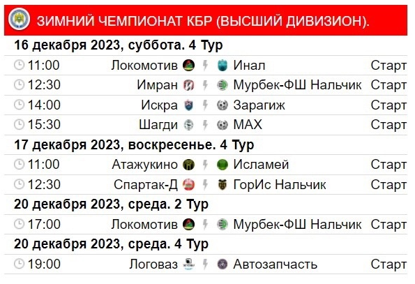 Сухие цифры показывают, что матч тура состоится на стадионе «Солнечный город» в воскресенье, 17 декабря, в 12:30. Встречаются дублеры нальчикского «Спартак», занимающие второе место, и «ГорИс Нальчик», который из-за пропущенной игры занимает лишь четвертое место.
