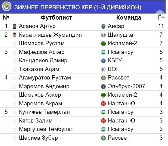 В трех матчах Асанов забивал не менее трех мячей. На его счету покер и два хет-трика. А лучшая результативность в одном матче принадлежит форварду «Исламея-2» Рустаму Шомахову. В игре с командой «ВОГ» он забил пять мячей. Кстати, в том матче еще три гола забил Аскер Шомахов.