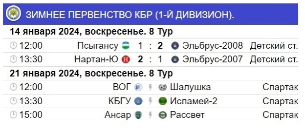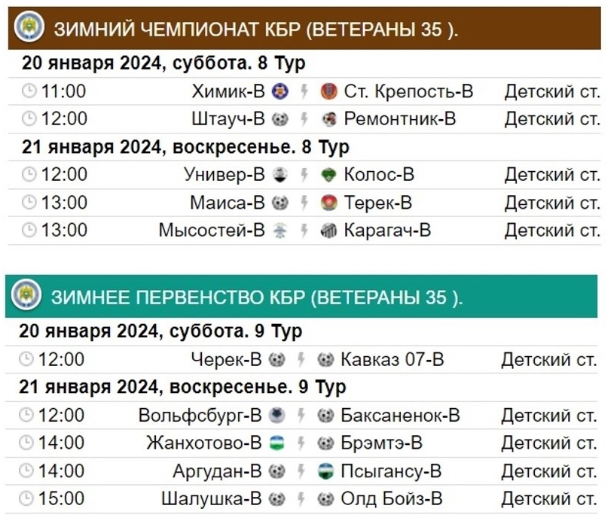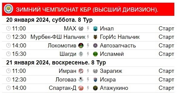 За неделю погода пришла «в порядок». На предстоящих выходных состоятся матчи 8-го тура Зимнего чемпионата КБР (высший дивизион), несыгранные матчи 8-го тура Зимнего первенства КБР (первый дивизион), 8-го тура Зимнего чемпионата КБР среди ветеранов (высший дивизион) и 9-го тура Зимнего первенства КБР среди ветеранов (первый дивизион).