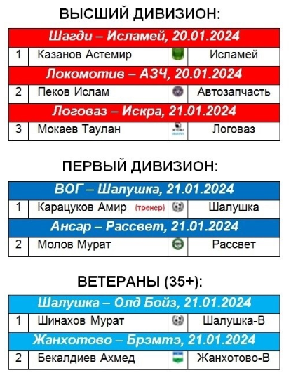 Список футболистов, пропускающих матчи 8--го тура Зимнего чемпионата КБР (ВЫСШИЙ ДИВИЗИОН), 8-го тура Зимнего первенства КБР (ПЕРВЫЙ ДИВИЗИОН), 9-го тура Зимнего первенства КБР среди ветеранов (ПЕРВЫЙ ДИВИЗИОН).